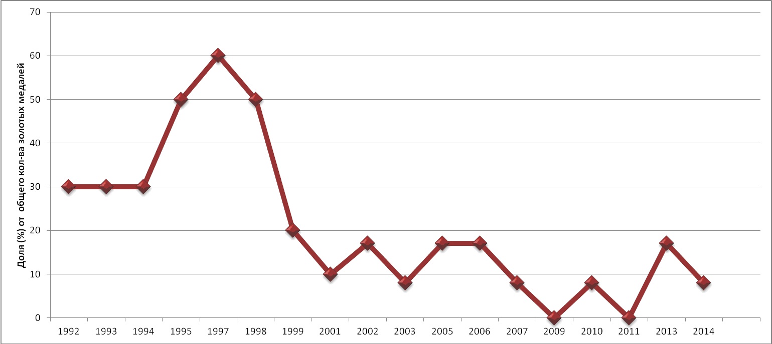 Доля (%) золотых медалей России на чемпионатах мира и Олимпийских играх в лыжных гонках