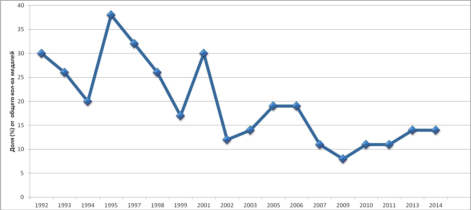 Доля (%) медалей России на Олимпийских играх в лыжных гонках