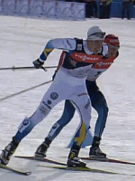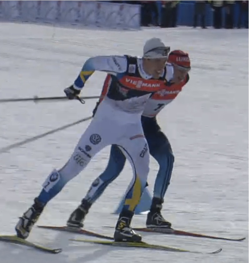 рис.2 На финише парного катания в ТДС, Калле Халфварссон продемонстрировал технику отталкивания “высокой пяткой”, перенятую у нашей Колхозницы (а). Олимпийский чемпион Александр Легков, как и полагается суровым лыжникам, шел рядом по-мужски прижимая пятку (б)