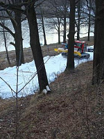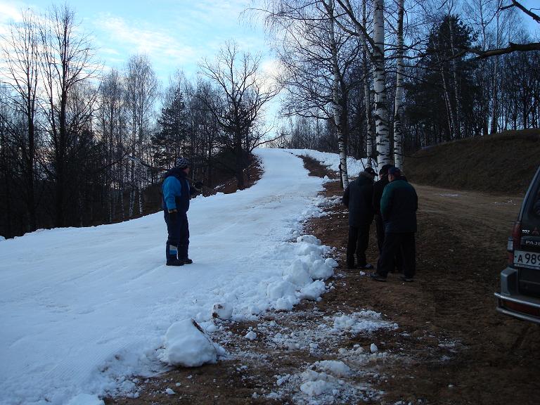 "Что ж там смотреть?" - пронеслось у меня в голове. Подождав несколько минут и поняв, что директор, наверное, вернется не скоро. По счастью, охранники оказались людьми добрыми и позволили мне пойти на трассу поговорить с директором самостоятельно. Я отправился на трассу на тот берег реки Баньки по кратчайшему пути от здания стадиона, и, когда я подошел к обрыву, передо мной открылась поистине чудесная картина. Через весь огромный первый подъем категории А до самой его вершины простиралась белая полоска снега, по которой упорно елозил ретрак. Пушек видно рядом не было.