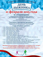 21 февраля в городе Одинцово пройдет спортивный праздник “День Лыжника”. В программе – соревнования по лыжным гонкам свободным стилем, выступления артистов. Также в этот день состоится официальное открытие Одинцовской лыжероллерной трассы после реконструкции.