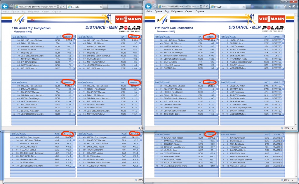 - вот, например, что я видел параллельно с трансляцией мужской пятнашку из Эстерсунда (лайв): я открыл четыре окна с онлайнами, выбрал из выпадающих списков все промежуточные отсечки и расставил их по кругам (круг был 5 км)