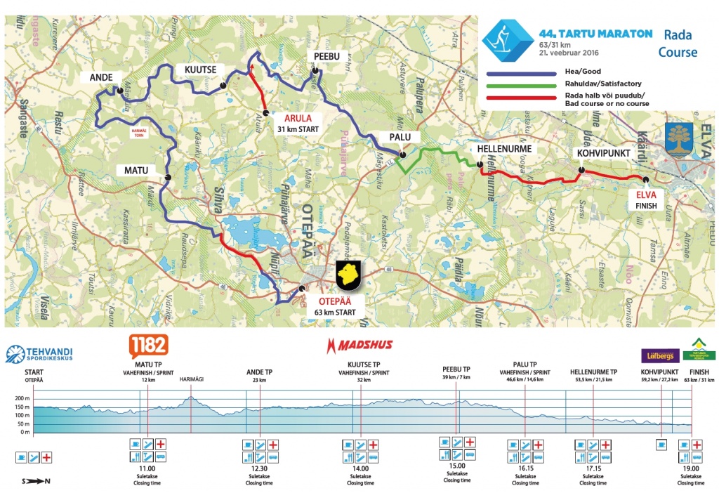 На карте показано, какие участки 63-километровой трассы Тартуского марафона в хорошем состоянии (можно проехать на хороших лыжах), какие в удовлетворительном состоянии (рекомендуется проезжать на плохих лыжах), а где трассы нет, либо она в очень плохом состоянии (катание не рекомендуется).