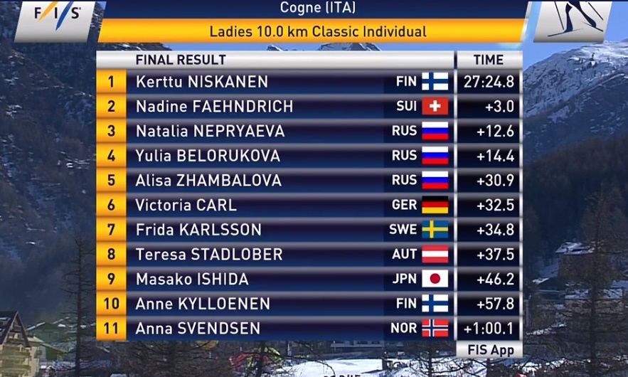 Победу одержала финка Керту Нисканен, второе место у представительницы сборной Швейцарии Надин Фаендрих, уступившей три секунды. Наталья Непряева проиграла победительнице 12.6 секунды, Юлия Белорукова уступила 14.4 и осталась четвёртой.