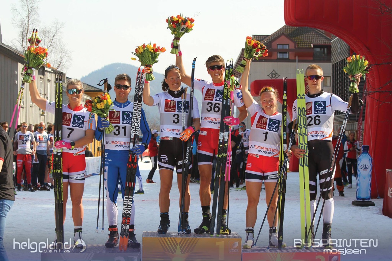 На дворе конец апреля, но ни по-летнему теплая погода, ни свежая зелень листвы не мешают любителям лыжных видов спорта продолжать следить за соревнованиями. Вчера в норвежском Мушёэне состоялся очередной старт под названием "Bysprinten". Это городской спринт, в котором традиционно принимают участие многие очень сильные лыжники. В этом году на гонку заявились Йоханнес Клэбо, Эрик Брансдаль, Эндрю Янг и Эндрю Масгрейв, Мари Эйде, а также чемпионы мира в двоеборье Ярл Магнус Риибер, Йорген Гробак и Эспен Бьернстад. Й. Гробак, Я.-М. Риибер, Э. Бьернстад Kombinertlandslaget