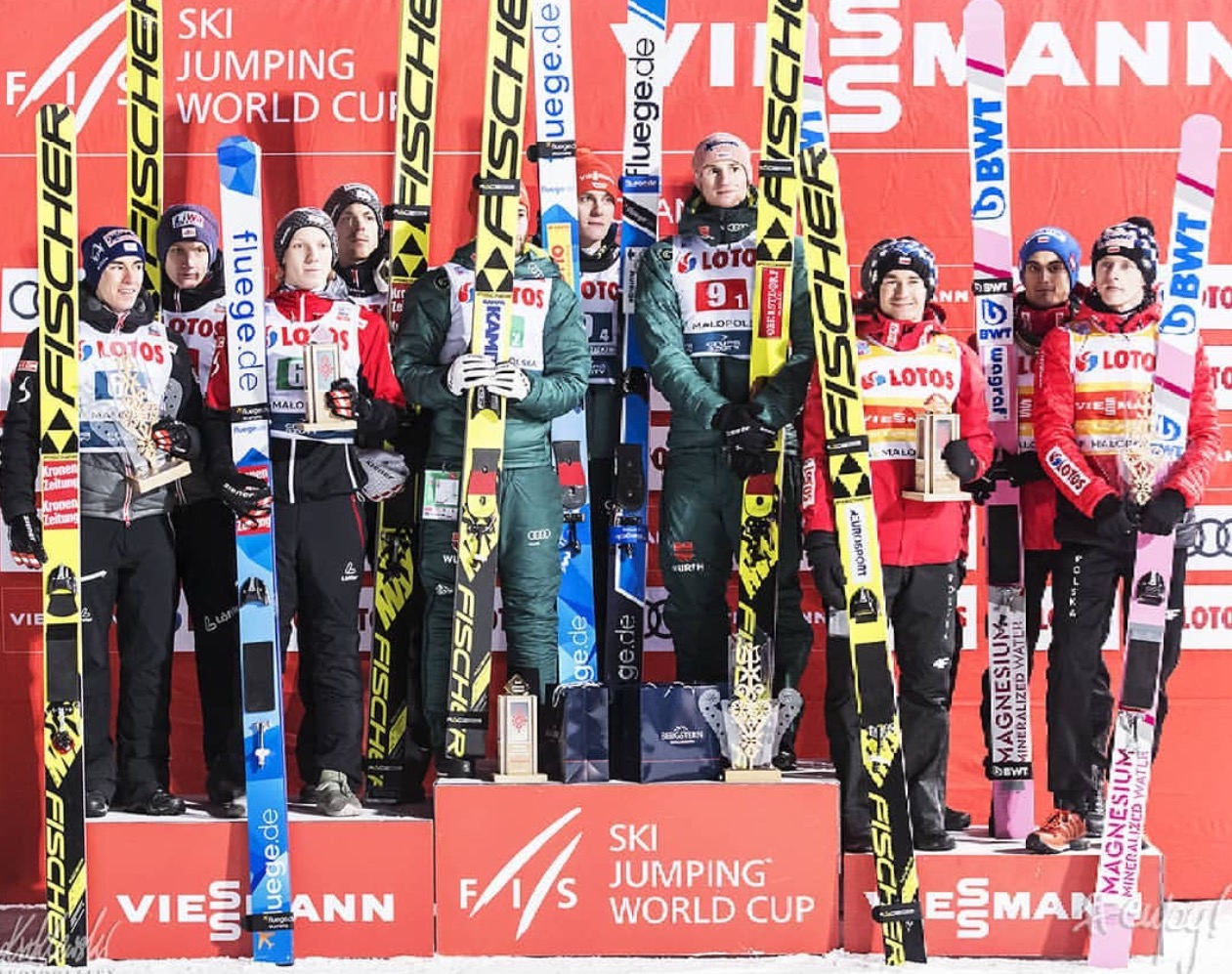 Третье место заняли поляки, но их призовое место на домашнем трамплине выглядело не столь убедительно. Правда, Давид Кубацки установил рекорд трамплина, составляющий теперь 143,5 метра (кстати, Маркус Айзенбихлер сегодня также стал рекордсменом, улетев на 143 метра, но его достижение продержалось недолго), но норвежца Йоханна-Андре Форфанга дисквалифицировали, и норвежцы автоматически выбыли из борьбы. А так, они могли бы и опередить хозяев соревнований.