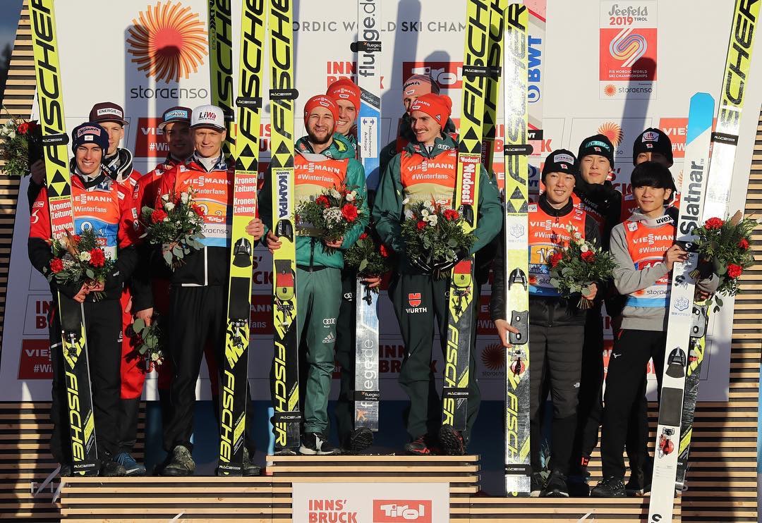 Филипп Ашенвальд, Михаэль Хайбек, Даниэль Хубер и Штефан Крафт добыли серебро, хотя одно время казалось, что они все-таки будут третьими. Однако у японцев не хватало сил обойти хозяев соревнований. Особенно неубедительно смотрелся Дайки Ито, да и Рею Кобаяси прыгал ниже своих возможностей. А вот его брат Юнсиро и Юкия Сато со своей задачей справились и совершенно заслуженно получили бронзовые медали. Seefeld 2019