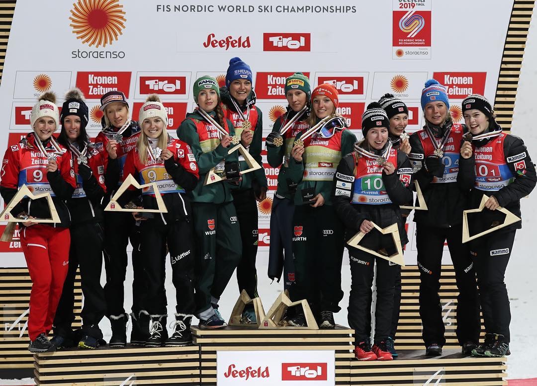 Последние результаты Кубка мира показывали, что немки являются основными претендентками на золото. Так и получилось, благодаря отличным полетам за 100-метровую отметку Рамоны Штрауб и Катарины Альтхаус немки уже после первого раунда выигрывали у норвежек более 10 баллов. Отставание, конечно, отыгрываемое за четыре прыжка, но норвежки не смогли воспользоваться даже небольшими ошибками своих конкуренток и в ходе второй попытки проиграли борьбу за серебро хозяйкам соревнований. Таким образом, немецкая четверка, за которую на этот раз выступали Юлиане Зайфарт, Рамона Штрауб, Карина Фогт и Катарина Альтхаус, завоевала золото и продолжила победную серию сборной Германии на трамплинах этого мундиаля. Ева Пинкельниг, Жаклин Зайфридсбергер, Кьяра Хельцль и Даниэла Ирашко-Штольц стали обладательницами серебряных медалей. Анна Один Стрем, Ингебьерг Саглин Бротен, Силье Опсет и Марен Лундбю завоевали бронзу. Seefeld 2019