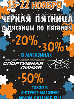 «Черная Пятница с пятницы по пятницу» – с пятницы по пятницу скидки от 20 % до 50% на все товары! Акция проводится в интернет-магазине и в розничных магазинах «Спортивная линия» в Петербурге.