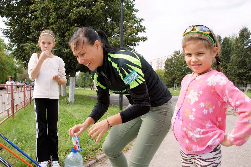 Трехкратная олимпийская чемпиона Юлия Чепалова с дочерьми Олесей и Васелиной на пункте питания Русской марафонской команды
