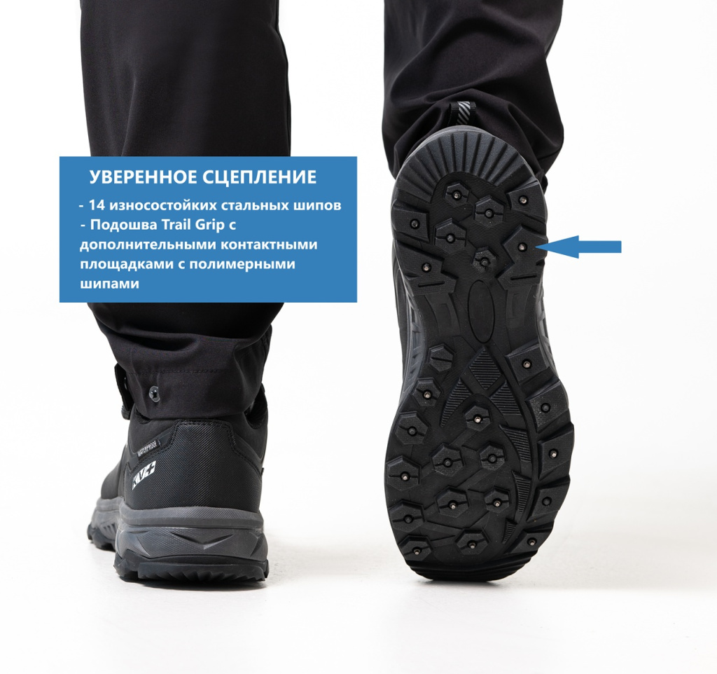 Отличный внедорожный рисунок подошвы в сочетании с 15-ю встроенными металлическими шипами – не единственное убойное преимущество этих интересных новинок. Еще два крутых аргумента – это мембрана и бесшнурковая застежка TWIST-LOCK. Все козыри на руках! Вернее, на ногах …