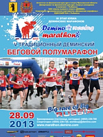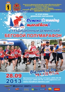 Уважаемые друзья! На официальном сайте Деминских марафонов www.marathon.demino.com открыты регистрации на V традиционный Деминский беговой полумарафон и восьмой традиционный Деминский лыжный марафон Worldloppet-2014! Деминский беговой полумарафон состоится 28 сентября 2013 г. в ЦЛС «Демино» (г. Рыбинск) в 11:00 МСК. Девушки и юноши смогут принять участие в забеге на 7 км, а спортсмены старше 18 лет - на 21 км.