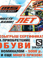В честь первого юбилея (5 лет) MASS SPORT проводит акцию - розыгрыш сертификата среди покупателей на приобретение обуви SALOMON на сумму 5000 рублей, а также много других поощрительных призов!