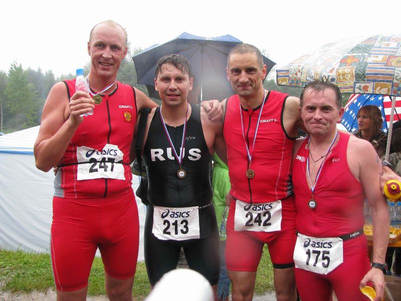 Команда скиспорта на финише триатлона Бережки 2008. Артём Яровиков, Андрей Золотых, Сергей Медведев и Игорь Пензюх. Фото не моё, но чьё - не знаю :(
