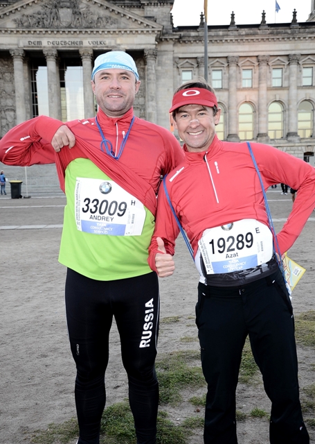 Андрей Кукрус и Азат Мулюков на фоне Рейхстага перед стартом Берлинского марафона