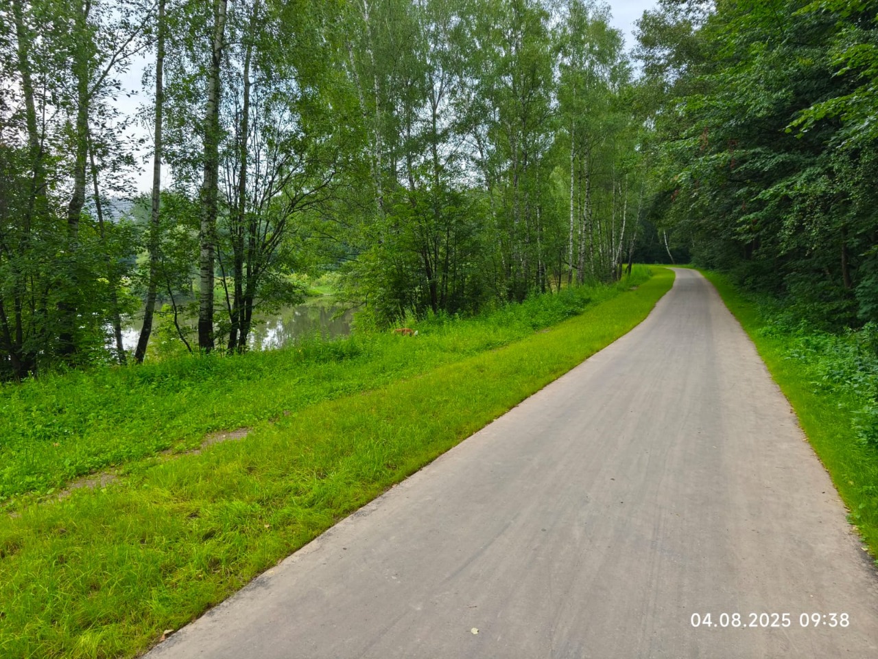 Асфальтовая лента поворачивает вокруг пруда.