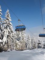 Остановка лыжного автобуса, курсирующего каждые полчаса, прямо у подножия склонов.