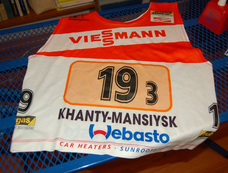 Что касается второго вопроса, от 7 февраля, на него точного ответа не дал никто. Ближе всех к правильному варианту оказался вариант Марины Кобятко, за что она получает биб (майку-номер) из Ханты-Мансийска-2003, с предыдущего домашнего для росссиян чемпионата мира по биатлону. Вот такой:
