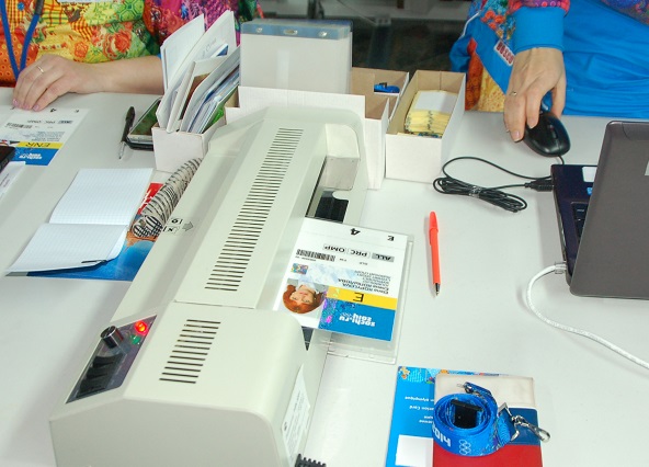 По прилету вас встречает волонтер и табличка "Аккредитация" прямо в комнате выдачи багажа. Собственно, саму аккредитацию нам выдали ещё в Москве, но её надо зарегистрировать у специального сотрудника и заламинировать, чтобы она стала действительной. Это делается за пять минут в ожидании багажа. Очереди нет. Багаж тоже не приходится ждать. Небольшой минус - не хватает багажных тележек, потому что самолеты садятся один за одном. Но на просьбу найти свободную тележку во двор бросается сразу с десяток волонтеров и через минуту с улыбкой тащат с улицы целую пачку. Пожалуйста! Все бойко говорят по-английски, а у некоторых на груди приколоты таблички с перечнем других языков, на которых к ним можно обращаться.