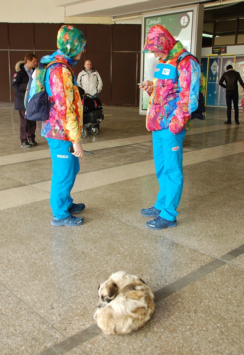 Первый щенок спит прямо на крыльце аэропорта, ещё две особи посапывают рядом в кустах. То же зафиксировали фотокорреспонденты на "Лауре", кошка живет (правда, от проверяющих её прячут) прямо в ресторане олимпийского парка. В прибрежной олимпийской деревне мне, правда, встретился гольф-мобиль, отлавливающий собак, но ничего страшного он с ними не творил, а просто вывозил за пределы деревни и отпускал. Что, в общем, правильно, потому что по деревне все на велосипедах, а собачки на них возбуждаются и пугают иностранцев.