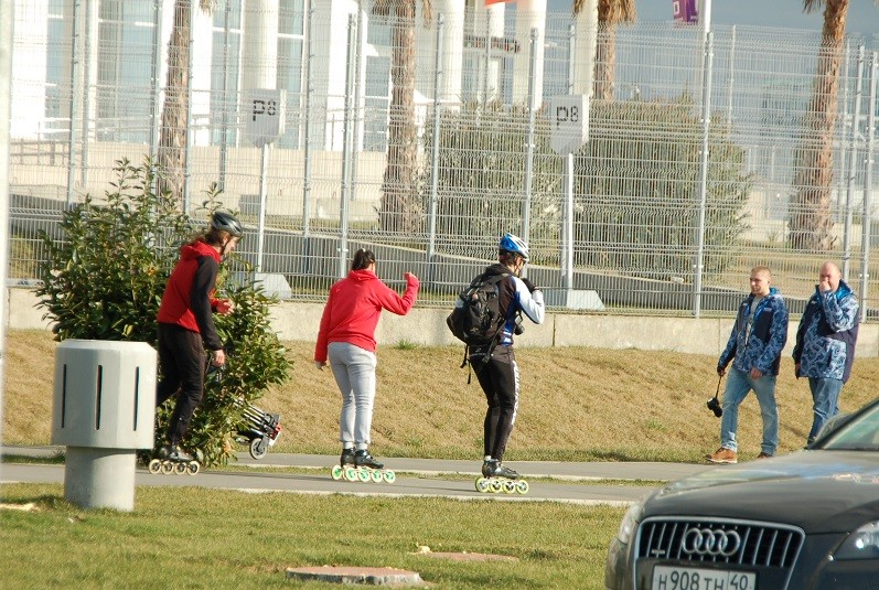 Некоторые болельщики передвигаются весьма необычными способами. Встречаются и скейтборды, много самокатов, великов и всевозможных их складных модификаций. Многие спортсмены привезли свои велосипеды, а конькобежцы тренируются на шоссейниках прямо в парке и деревне