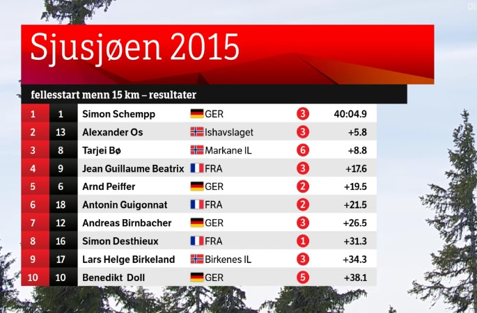 Победа Симона Шемпа также была одержана на заключительном круге дистанции. Последняя стойка неудачно сложилась для Уса: пришедший лидером норвежец допустил два промаха, в том числе пятым выстрелом - досаднейший габарит. Его соперники промахнулись по одному разу, и на дистанцию вплотную за Усом ушёл Симон Шемп, который и выиграл, оторвавшись от норвежца на одном из подъемов.