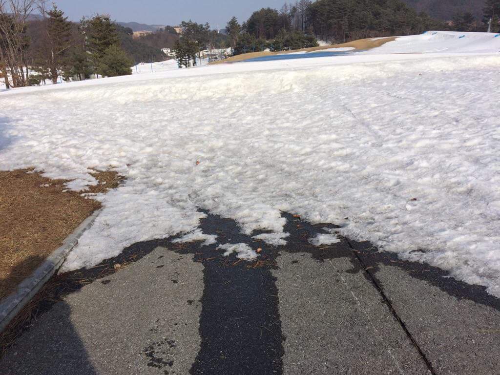 По телетрансляции были заметны большие куски потускневшего снега. Это в основном участки с таявшим и подмерзшим снегом несколько раз.