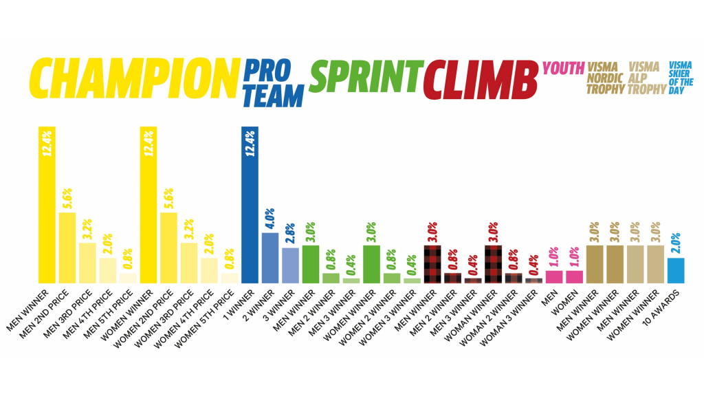 Так, победителю общего зачета серии полагалось 31000 €, такую же сумму получила и команда Рамудден, выигравшая командный зачет турнира. Победители спринтерского и горного зачетов получили по 7500 €, как и победители Альпийского и Северного трофеев. Победители в молодежном зачете получили по 2500 €.