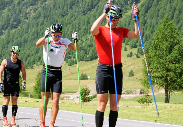 Сложный рельеф для лыжероллерных тренировок можно найти, только поднимаясь по шоссе на ближайшие перевалы, соединяющие Италию со Швейцарией. Такие тренировки требуют особенной организации. После непрерывного многокилометрового подъема приходится спускать спортсменов в долину на автомобиле, потому что спуск на лыжероллерах в отдельных местах горного серпантина небезопасен. А затем снова повторяется горовосхождение. Конечно, такие тренировки требуют основательной горной адаптации и серьезного настроя.