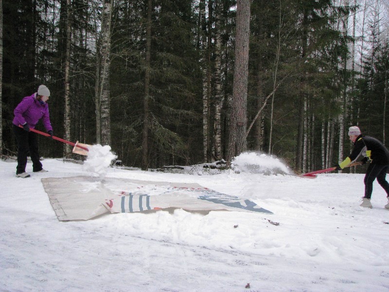На двух снегоходах к дальним петлям привезли несколько десятков лопат, куски старых баннеров и оставили тренеров один на один с остатками снега и замерзшей обледенелой дорогой.