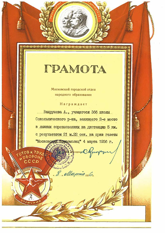 Альберт Леонидович Вахрушев, известный человек в лыжном мире, который сейчас сам возродил и проводит другую детскую гонку – на призы «Пионерской правды». У Альберта Леонидовича сохранились дипломы, которыми он сам был награжден за 2-е место в гонке на приз «МК» в 1956 году, показав а «пятерке» результат 21 мин. 22 сек. По его словам, детская гонка на приз «МК» в 50-60-е годы считалась одной из самых важных и значительных, и все юные лыжники, в будущем ставшие олимпийскими чемпионами и победителями мировых чемпионатов, обязательно в ней участвовали.