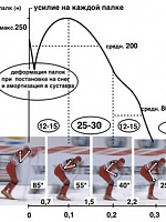 В диапазоне скоростей от 21 км/ч до 30 км/ч общее время отталкивания руками составило от 0,34 сек до 0,26 сек, общее время цикла 1.2 - 0,9 сек. Пиковые значения максимальных усилий от 230 до 270 ньютон достигались через 0,12 - 0,08 сек от момента втыкания штырей.