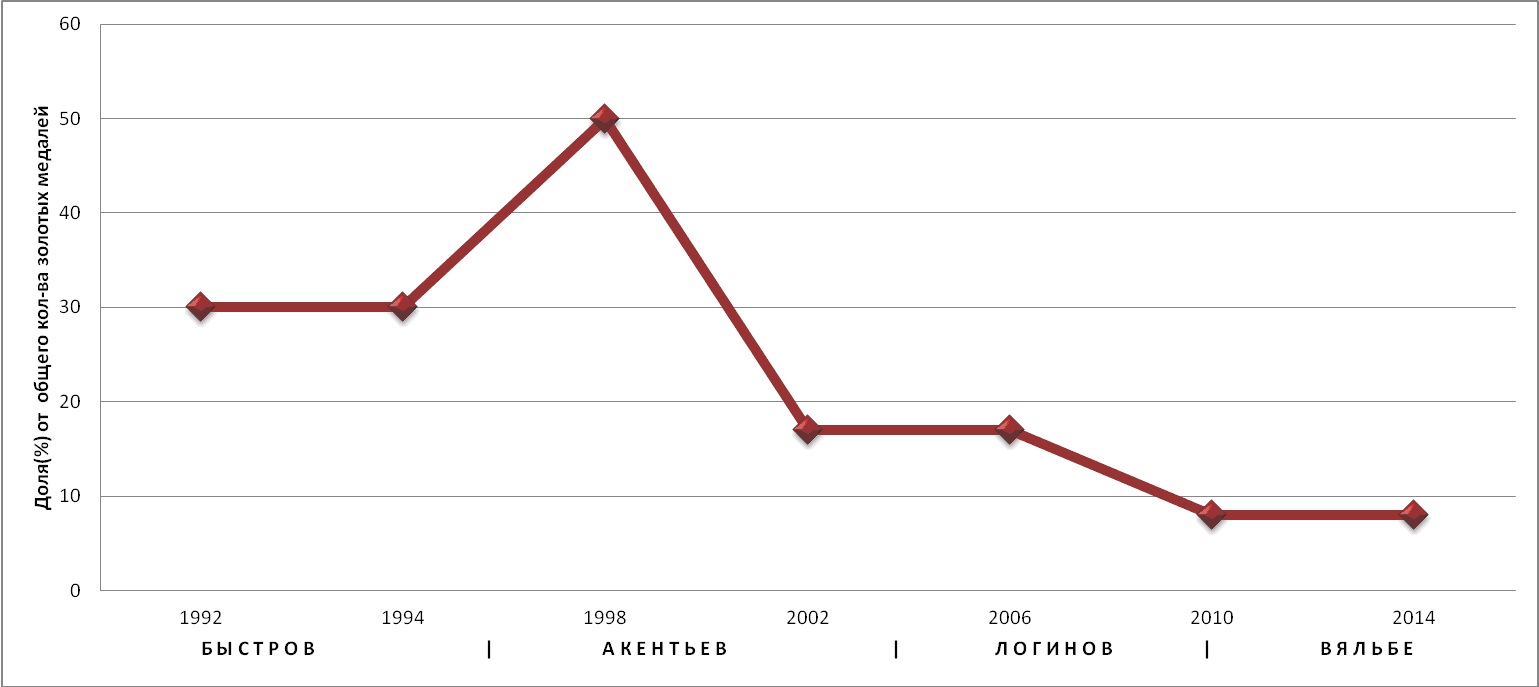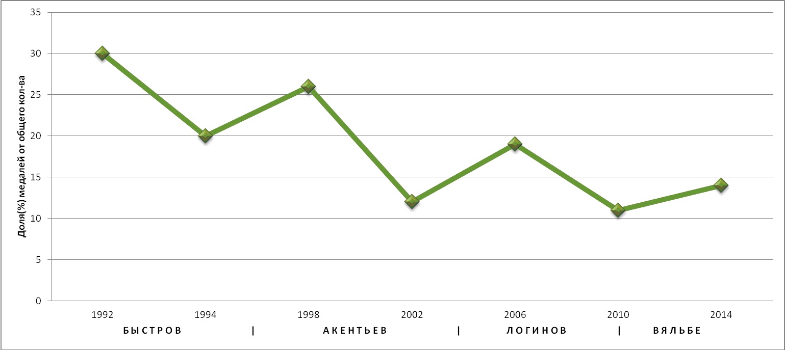 Второй график учитывает эти же итоги только для Олимпийских турниров. Собственно, это и есть главные показатели подготовленности сборной команды и работы национальной федерации. Руководителями ФЛГР за этот период были четыре президента: Б.М. Быстров (до 1996г.), А.В. Акентьев (1996-2004гг.), В.А. Логинов (2004-2010гг.), Е.В. Вяльбе (с 2010г.).