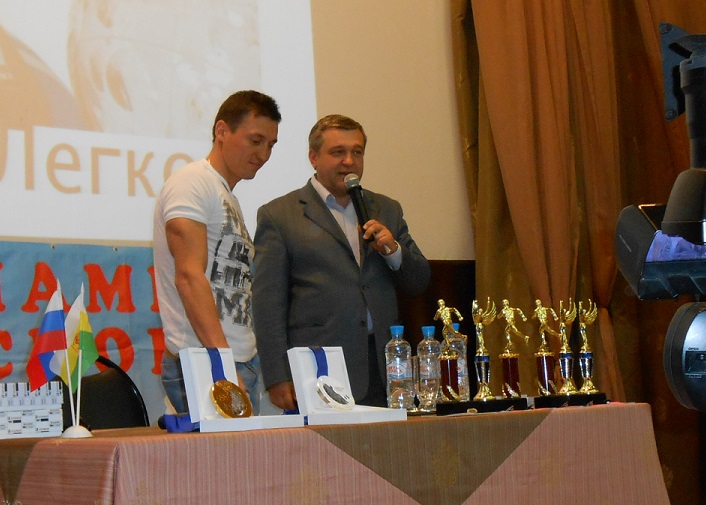 Затем Александр поднялся на сцену (под бурные и продолжительные) и вытащил (это уже под переходящие в овацию) из аккуратных белых коробочек две медали. Серебро эстафеты и марафонское золото.