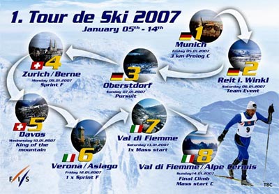 Новый 2007 год лучшие лыжники всего мира будут встречать «на колесах». С 29 декабря по 7 январе элите лыжных гонок придется пробежать сразу 8 гонок, объединенных в одну большую, многодневную гонку. Из Тур де Ски будет состоять весь второй период Кубка мира, но чтобы набрать очки в кубковый зачет, необходимо финишировать во всех восьми гонках.