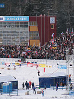 В небольшой зал, опять же очень похожий на студенческую аудиторию, набивается толпа журналистов. Многие подбираются поближе к сидящим напротив спортсменам, чтобы задать свои вопросы. Для иностранных спортсменов есть переводчик. За всем следит представительница FIS. Атмосфера очень дружественная, спортсмены вызывают большую симпатию - они счастливы, они победили. Отвечая, спортсмены шутят и балагурят. Не верится, что совсем недавно они боролись на пределе своих человеческих возможностей и, может быть, выложили все силы для победы. Иностранных победителей «мучают» меньше, чем наших, а потом и вовсе отпускают. Наших же обступает толпа журналистов и продолжает свое интервью. Вопросы-ответы становятся всеобщим достоянием, но каждое издание подает их по-своему. Журналисты трудятся не только в пресс-центре, но и повсюду видны «охотники» и интервьюируемые. А потом за совсем небольшое время, остающееся до следующего забега, журналисты успевают обработать информацию, сделать подборку из интервью, а также расписать то, что происходило на стадионе. Это происходит не в тихом спокойном кабинете, а в той самой пресс-комнате на третьем этаже, «на переменке». Как они могут сосредоточиться, ухватить самое главное, рассказать о самом интересном, да еще и взять у всех интервью? Фантастика!