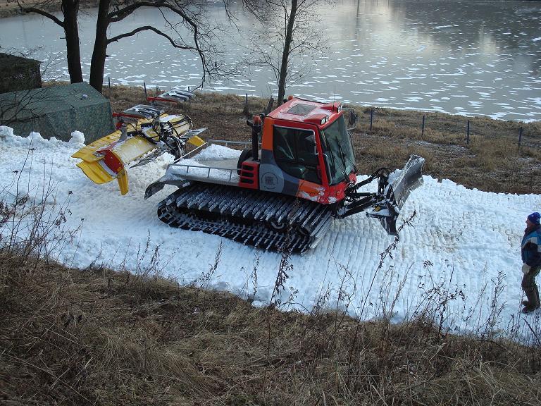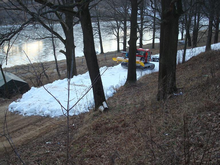 "Что ж там смотреть?" - пронеслось у меня в голове. Подождав несколько минут и поняв, что директор, наверное, вернется не скоро. По счастью, охранники оказались людьми добрыми и позволили мне пойти на трассу поговорить с директором самостоятельно. Я отправился на трассу на тот берег реки Баньки по кратчайшему пути от здания стадиона, и, когда я подошел к обрыву, передо мной открылась поистине чудесная картина. Через весь огромный первый подъем категории А до самой его вершины простиралась белая полоска снега, по которой упорно елозил ретрак. Пушек видно рядом не было.