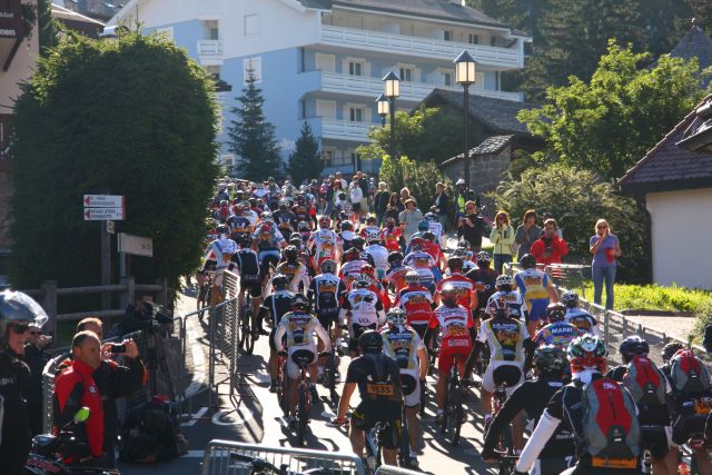 Наверное, самым трудным было правильно распределить силы по ходу гонки. Прямо со старта байкеры должны были преодолеть подъем в район Dantercepies недалеко от перевала Гардена – перепад высот на этом участке составляет 750 метров при длине подъема в 5 км. Затем идет затяжной спуск в сторону Корвары, где два круга – большой и малый – расходятся. Те, кто решил ехать 50 км, доезжают до Арабы, и оттуда начинают подъем на перевал Пассо Пордои, «большой» круг сначала уводит в сторону одной из вершин, и только затем вновь сливается с «малым» - за пару километров до Пассо Пордои.
