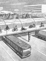 Суть такова: по нижнему ярусу прозрачной “трубы” велосипедисты едут в одну сторону, по верхнему — в другую. Зимой сооружение отапливается, а летом в нем открываются окна. Через каждые 200—300 метров располагаются станции. Таскать велосипеды с собой не нужно — их (причем не абы какие, а специальные, облегченные модели) можно свободно взять на входе.