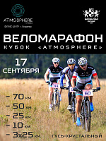 17 сентября в городе Гусь-Хрустальный Владимирской области пройдет седьмой веломарафон «Кубок "Атмосферы"». Круг 25км, слабая пересеченка, приятная компания, осенний колорит! Теперь и в формате эстафеты. Дистанции по категориям составят: Элита, Эстафета - 75 км (три круга); Любители - 50 км (два круга); Леди, Ветераны - 25 км (один круг); Детская: 10 км (два круга по 5 км).