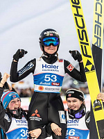 Во втором раунде Зайфарт прыгнула ниже своих возможностей и пропустила вперед хозяйку соревнований, Даниэлу Ирашко-Штольц. Но австрийка атаковал подиум с 8-й позиции, так что еще перед двумя заключительными попытками было ясно, что до золота ей не добраться. Катарина Альтхаус значительно опередила текущего лидера, приземлившись на 107-метровой отметке. Но ее телемарк судьи нашли не идеальным, а главное, положительная ветровая компенсация оказалась совсем маленькой. Марен Лундбю выполнила очень качественный прыжок, но зато проиграла немке 2,5 метра, так что до последнего было не понятно, кто же все-таки одержит победу. В итоге золото досталось норвежке, опередившей немку всего на 0,5 балла. 36-летняя Ирашко-Штольц завоевала бронзу, принеся очередную награду австрийской команде в этот непростой для нее день... К. Альтхаус, М. Лундбю, Д. Ирашко-ШтольцSeefeld 2019
