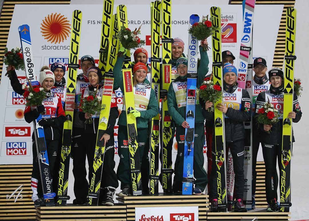 Во второй попытке немцы прыгали еще лучше и без особого труда обыграли австрийцев. Так что Катарина Альтхаус, Юлиане Зайфарт и Карл Гайгер стали двукратными победителями соревнований чемпионата мира в Зеефельде, а Маркус Айзенбихлер завоевал свое третье золото. Ева Пинкельниг, Филипп Ашенвальд, Даниэла Ирашко-Штольц и Штефан Крафт довольствовались серебряными медалями, а норвежская четверка, за которую выступали Анна Один Стрем, Роберт Йоханссон, Марен Лундбю и Андреас Стьярнен, заняла третье место. Хотя после провального прыжка Стьярнена в первой попытке шансы на место на пьедестале резко упали, во втором раунде норвежцы собрались и не позволили никому из соперников опередить себя в борьбе за бронзовые награды. Seefeld 2019