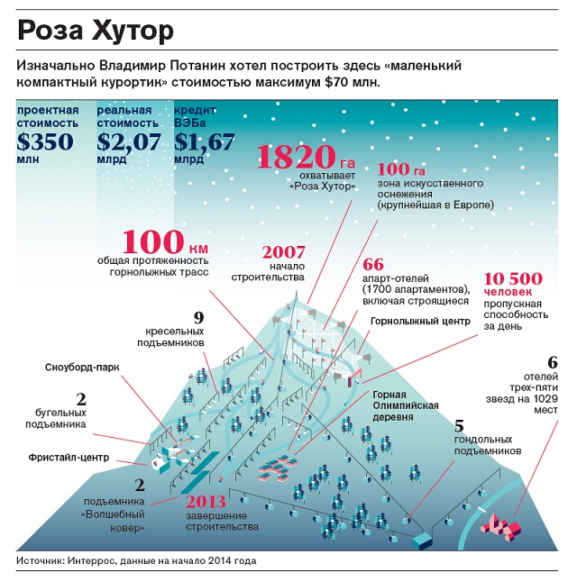 — Понимаете, чтобы курорт жил, для этого нельзя отнять денег у нас больше, чем мы зарабатываем, — объясняет Потанин. — Потому что для «Розы Хутор» нужно в ближайшие после Олимпиады кварталы проинвестировать 4,5 млрд рублей, в том числе чтобы превратить курорт из зимнего в круглогодичный и из чисто спортивного — в доступный для массового посетителя. И свободному cash flow для этого просто неоткуда взяться.