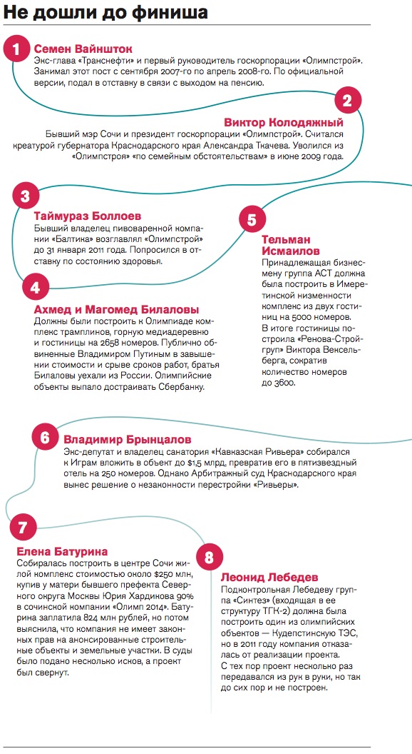 Дезориентированы были не только медведи. После триумфа в Гватемале перед олимпийскими функционерами встал вопрос — как построить город практически с нуля, быстро и эффективно. Механизм федеральных целевых программ не подходил — стройка затянется на десятилетия. На волне тогдашней моды на госкорпорации был создан «Олимпстрой», структура с нечеткими полномочиями и неясным юридическим статусом. По выбору Путина компанию возглавил бывший глава «Транснефти» Семен Вайншток, который уже через полгода ушел в отставку, получив затем орден. С тех пор на олимпийской стройке началась чехарда: год президентом «Олимпстроя» работал экс-глава Сочи Виктор Колодяжный, после него был назначен бывший владелец пивоваренной компании «Балтика» Таймураз Боллоев, который через полтора года уволился по состоянию здоровья. В итоге достраивать олимпийские объекты пришлось малоизвестному чиновнику Сергею Гапликову.