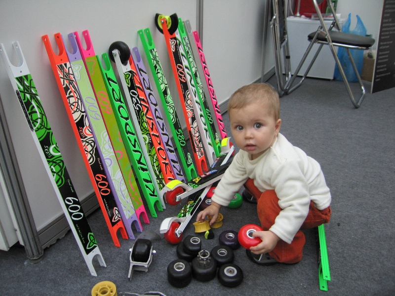 Чёрные – это из резины. Радикально поменяв технологии литья и используемые литьевые машины, полностью переделав под эти процессы пресс-формы, получились и такие колёса. Их испытания продолжались всё это лето, и пока они не пошли в серию. Те колёса получились ну уж слишком медленные и, одновременно, имеющие пока средний ресурс по степени истираемости, примерно 500км. у взрослых. На этой фотографии колёса уже из другого состава резины, но их не успели испытать в «полевых» условиях. Весной эти испытания вновь продолжатся. Заодно, будут испытаны эти же колёса, но с другими составами резины. Не включая те, что на фото, будут отлиты и откатаны ещё пять образцов колёс с абсолютно разной резиной. Вот из них и выберут лучшие.