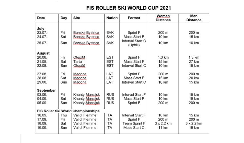 Комитет FIS по лыжероллерам на своем майском совещании рассмотрел календарь основных международных соревнований сезона 2021 г. Четвертый этап Кубка мира должен принять в сентябре Ханты-Мансийск. В Словакии, Эстонии, Латвии пройдут другие этапы. Чемпионат мира в Италии завершит роллерный сезон. Проект этого международного календаря будет окончательно рассмотрен для утверждения комитетом FIS по лыжным гонкам в конце мая.