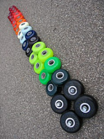 Здесь, на следующем фото, это уже другие подобные изделия. Они сделаны из более мягкого полиуретана, чем подобные колёса от этого же российского производителя. По своей твёрдости они мягче также и своих импортных аналогов, но будут несколько быстрее их по скорости. Их только-только начали вновь выпускать после долгого перерыва и изготовили их пока не столь много по количеству. Мягкие, комфортные, великолепно гасящие вибрации на грубом асфальте, очень цепкие при любом состоянии погоды и покрытии дороги, а ещё, они ведь и весьма катучие. В целом ряде спортшкол, особенно у малышей, они уже стали самыми любимыми и востребованными.