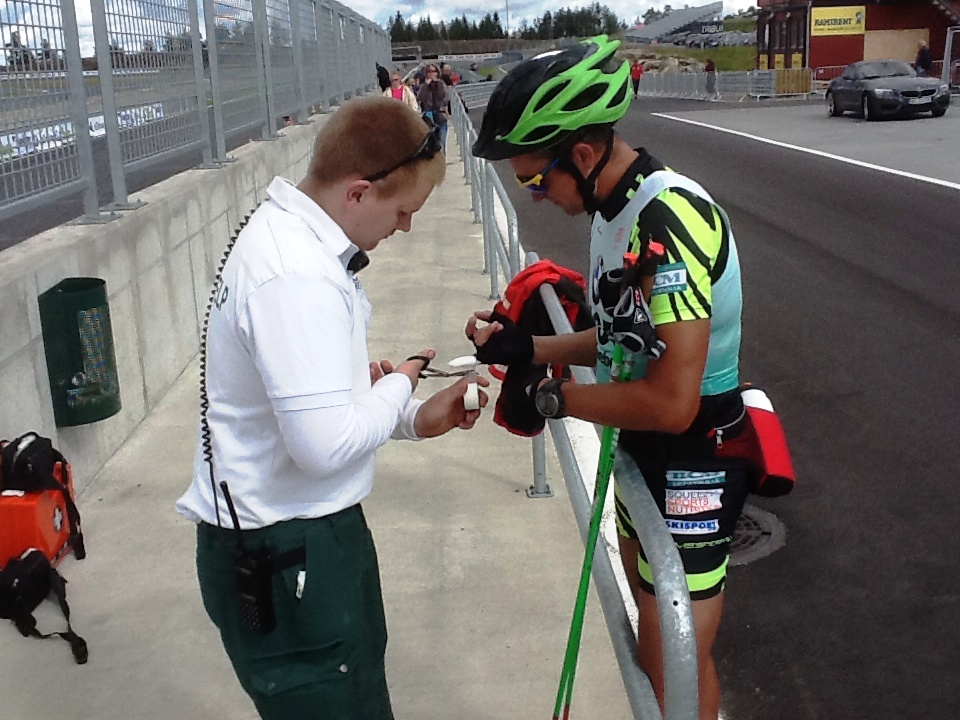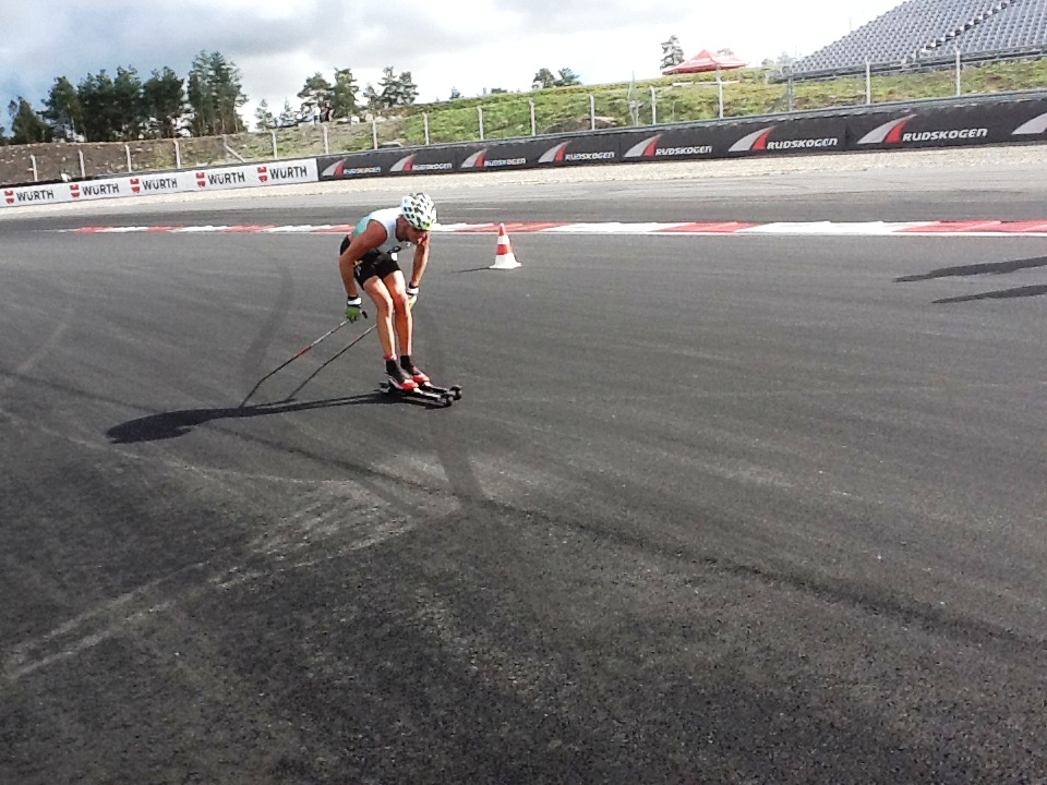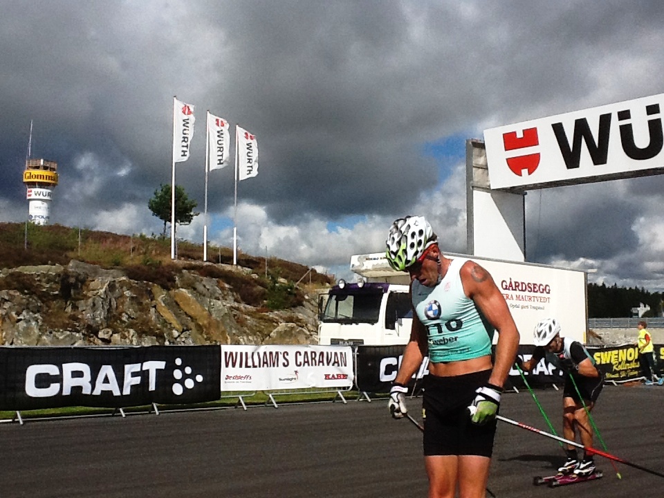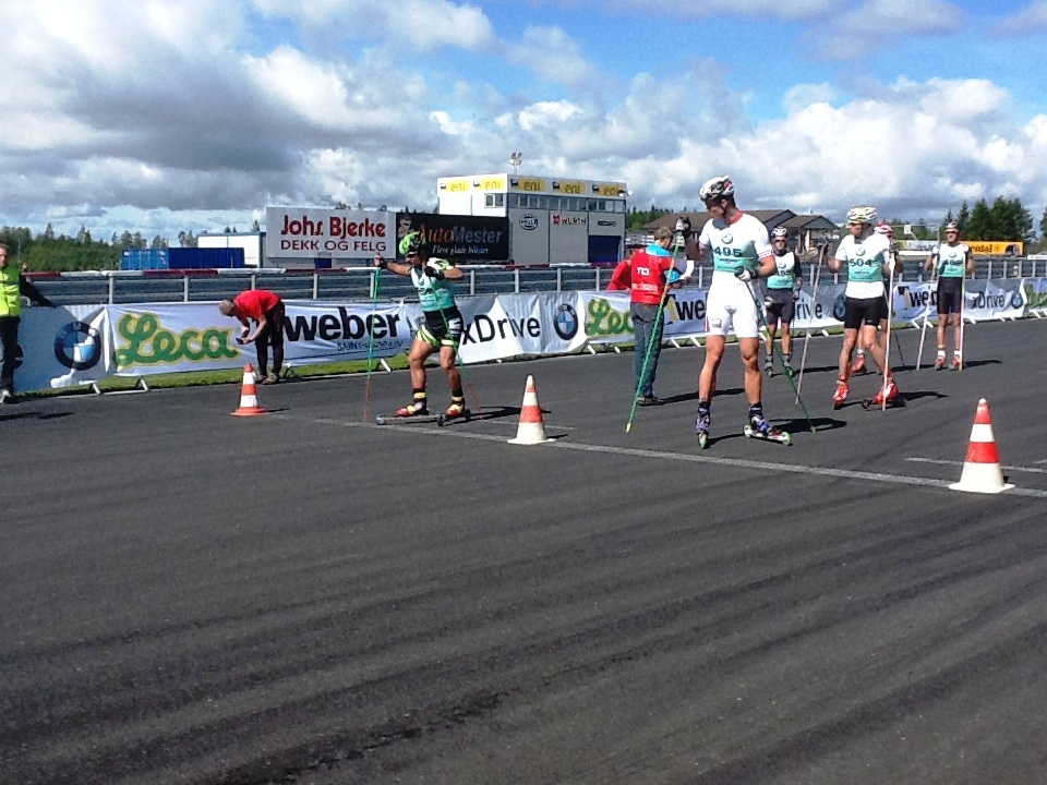 Антураж гонки был необычен прежде всего из-за особенностей трассы, а точнее - автомотодрома. Кажется, впервые ее участникам пришлось гонятся по широченному треку с идеальным асфальтом да, и еще с весьма непростым рельефом. Кстати, крупнейший автомотoцентр Норвегии Rudskogen первый раз устраивал такие состязания. Дистанция состояла из 12 кругов по 3,3 км. Трудностей добавил довольно сильный ветер, ощущавшийся практически на каждом метре открытой трассы. Организаторы экипировали всех участников неполного марафона роллерами Elpex с достаточно быстрыми колесами (для знатоков - N 2). Средняя скорость лидеров составила 28 км/ч.