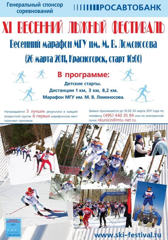 11-й Весенний лыжный фестиваль РОСАВТОБАНКА состоится в Красногорске 26 марта 2011 года. В прошлом году в рамках фестиваля впервые было проведено первенство МГУ на марафонской дистанции, а в этом году и сам марафон получил имя Московского Государственного Университета.