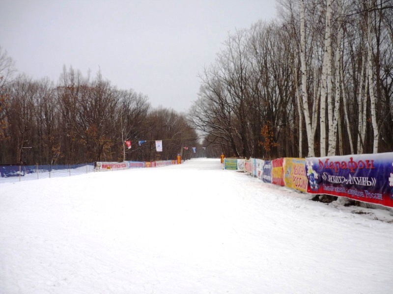Единственный недостаток – это всего лишь пятикилометровый круг, преодолевать который приходится целых 10 раз. Но это лучше, чем всю дорогу по ухабам и кочкам. Круг вылизан настолько, что даже прошедший 7 марта снегопад не сумел его испортить. Везде можно идти вдвоем, а в некоторых местах и втроем коньковым ходом. Сумма набора высоты на круге - 125 метров, что выдает на марафоне более километра. На круге два поворота на 180 градусов, но они после подъемов, и не так сильно чувствуются. Кроме одной горки, которая с каждым кругом давалась мне тяжелее и тяжелее, везде можно идти, толкаясь на каждый шаг.
